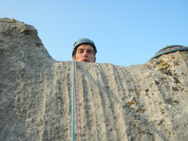 Второто въже започна с пасаж, който ми коства доста усилия и след лек дюлфер по-нагоре, излязох на терасата доста напомпан. До този момент не знаех какво следва след тази тераса, тъй като от долу не се виждаше тази част от стената. Не беше ясно дали има излизане от тук въобще. Тръгнах по естествената линия нагоре няколко метра и се озовах на гладка плоча. След кратко разучаване, разбрах какво би било евентуалното преминаване, но не бях сигурен дали ще успея да го направя. Осигуровката тук също беше доста крива. Сложих 2 френда в хоризонтална цепка и пробвах. Първия път, не се получи и откатерих обратно да почина и да помисля. Втория път промених малко положението на тялото, и ето че стана. Почуствах се много доволен.
