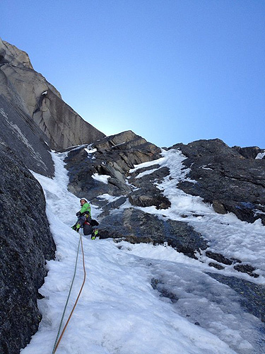 На 7 юни сутринта Хеликър и Брейски стигнаха с лифта до План и със ски бързо се придвижиха до основата на стената. Около 11.00 часа започнаха катеренето и преминаха с взаимна осигуровка стръмните, но вървящи по сигурен лед първи три въжета. След това, с оскъдна последователна осигуровка, преодоляха следващите три дължини по все още добър лед. Но с набирането на височина ледът ставаше все по-тънък. По скалните въжета (“Фантастичен гранит!” – писа Брейси) катериха без ръкавици до площадките в половината от височината на стената, където “Birthright” свършва.