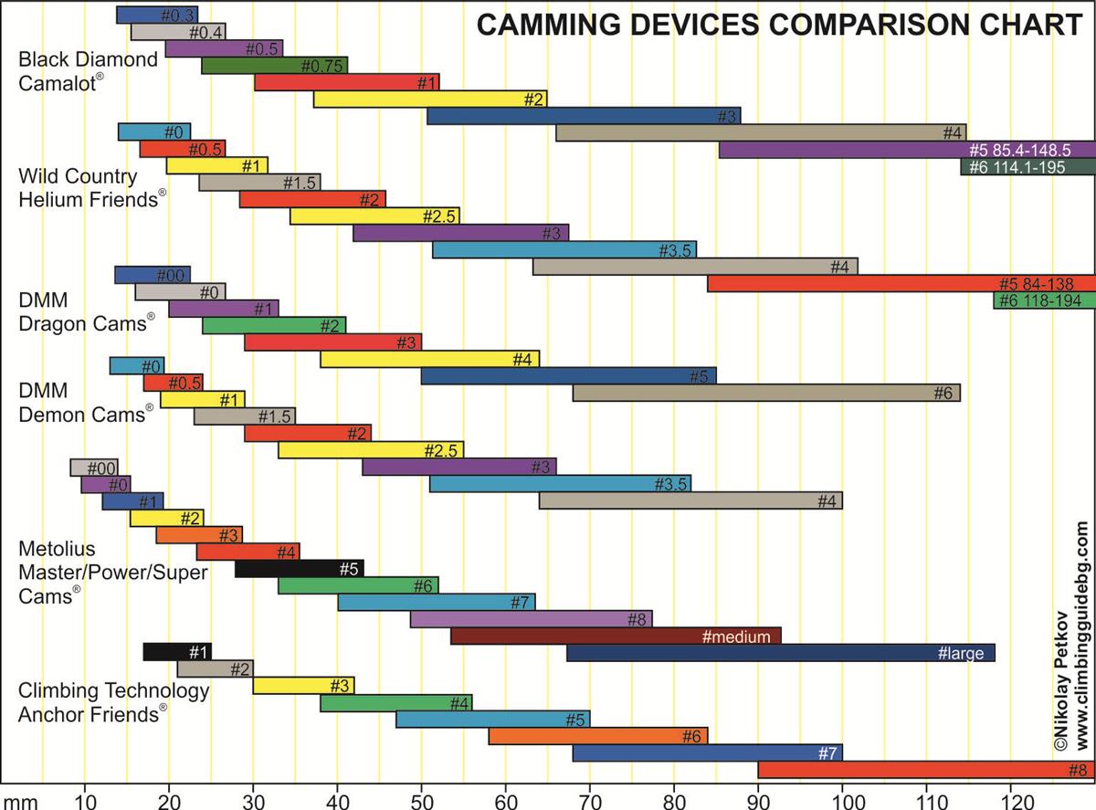 Всичко много хубаво, ама такава таблица съществува от край време http://www.climbingtechniques.org/uploads/4/9/7/5/4975151/cam-size-comparison-chart-v2.pdf, освен това понятието "Camming Devices" e много общо тъй като включва клеми, френдове, биг брос, екцентрици и всичко друго, което може да се заклещи в цепка ;-) Основното деление е на пасивни (passive chocks) и механични (mechanical chocks). За да бъдете по коректни, бих ви препоръчал да използвате по-тесния термин "Spring-Loaded Camming Devices" или направо френдове.