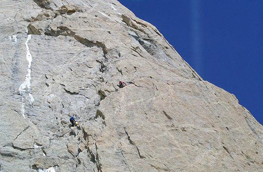 Система от цепнатини и плочи им позволи да катерят класически (без изкуствени опорни точки) в долната част на стената. Но плановете за прокарване на чисто класическа линия се разсеяха на 20-метровата зона от мокри скали, “оросявани” от пръските на разположен в съседство водопад. Две въжета съвпаднаха с Маршрута на Джордани от 1988 г., след което се придвижваха по микстов терен вляво, чак до финалния гребен. Няколко къси въжета ги изведоха на самия връх.