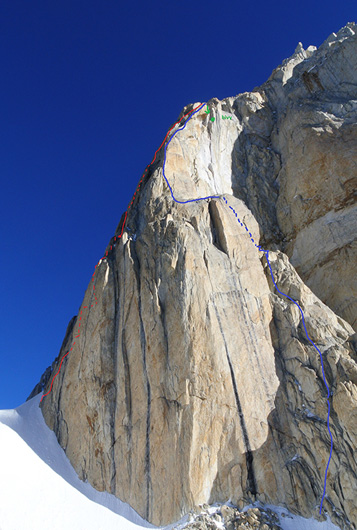 Югозападната стена на Ули Биахо, с червено е