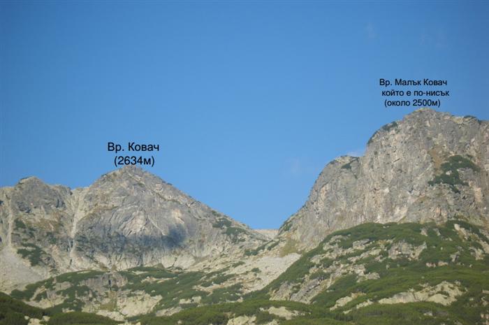 Вр. Ковач (2634 м), вр. Малък Ковач, който е по-нисък (около 2500 м). Изглед на двата върха от югоизток.