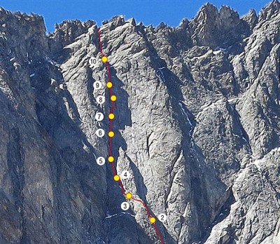 След бивак под стената Том и Саймън тръгнаха по него на 18 август т. г. Теренът и трудностите, според тях, са сравними с тези по Маршрута на Бонати по Пилие Руж дю Бруйяр, със забележката, че в горната част трудностите намаляват. Тъй като изкатереното ребро извежда до върха на кулата, наречена Поан Алфонс Куте (3660 м, Pointe Alphonse Couttet, Алфонс Куте е знаменит гид от Шамони в периода преди Втората световна война – бел. пр.), двамата нарекоха премиерната си линия “Pilier Alphonse Couttet” (350 м, 9 въжета, TD, 6a+).