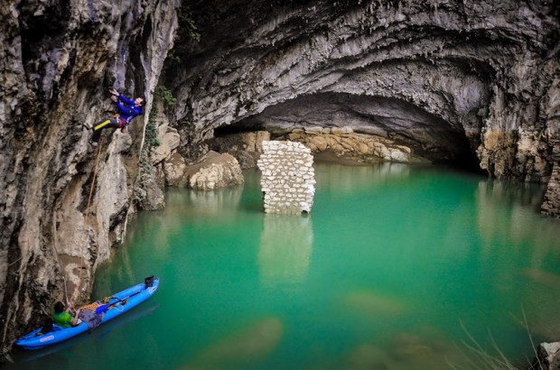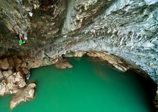 Изглежда като deep water solo. А в действителност това е новата линия на Клемен Бечан (Klemen Bečan) в Осп (Osp), по-точно в сектора Пайкова стреха (Pajkova streha), наречена “Water World” и с оценка 9a. “Water World” е не само катерене, но и сериозен логистичен проблем – старт от каяк и използване на тролей.
