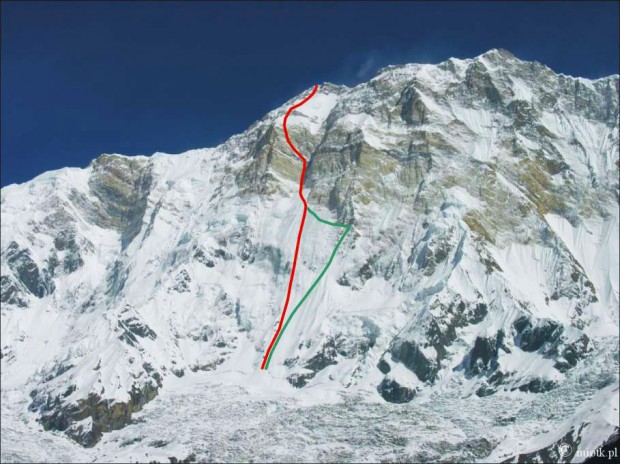 Новите маршрути по южната стена на Анапурна от 2013 г. – с червено е маркирана