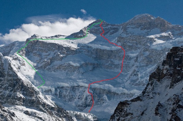 Северната стена на Кангчендзьонга – с червената линия е означен планираният нов маршрут, със зелената – Британският маршрут (Scott-Boardman-Tasker Route) z 1979 r.