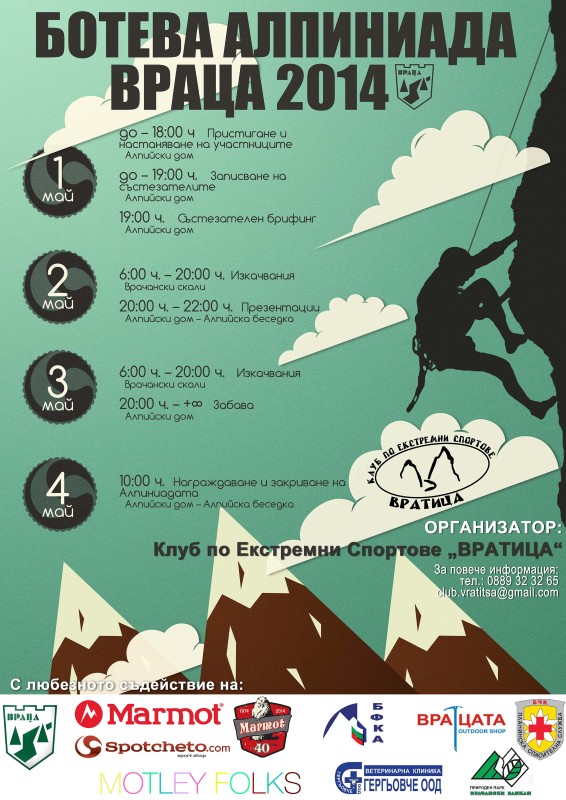 За пета поредна година Клуб по Екстремни Спортове "Вратица" има удоволствието да Ви покани на "Ботева алпиниада - Враца 2014". Събитието ще се проведе  от 1-ви до 4-ти май на обичайното място - прохода Вратцата до град Враца.