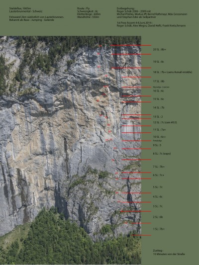 Намиращата се в Швейцария долина Лаутербрунен (Lauterbrunnen) е известна в Европа като “Мека”-та на B. A. S. E. – скачачите. Нейните отвесни варовикови стени винаги са привличали и алпинистите, още повече че долината се намира близо до Айгер. Една от тамошните стени – Щалдефлуе (Staldeflue), си избра за цел известният швейцарски катерач Рогер Шели (Roger Schäli).