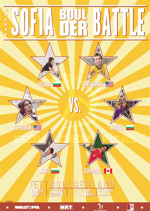 Каним ви на изключително атрактивно състезание по спортно катерене, в което ще участват трима от най-добрите катерачи в света - Крис Шарма, Дейв Греъм и Шон Макол, както и някои от най-популярните българи в този спорт. Събитието започва днес, 4.7.2014 г. в 20 часа в София, Boulderland, Paradise Center ниво+3.