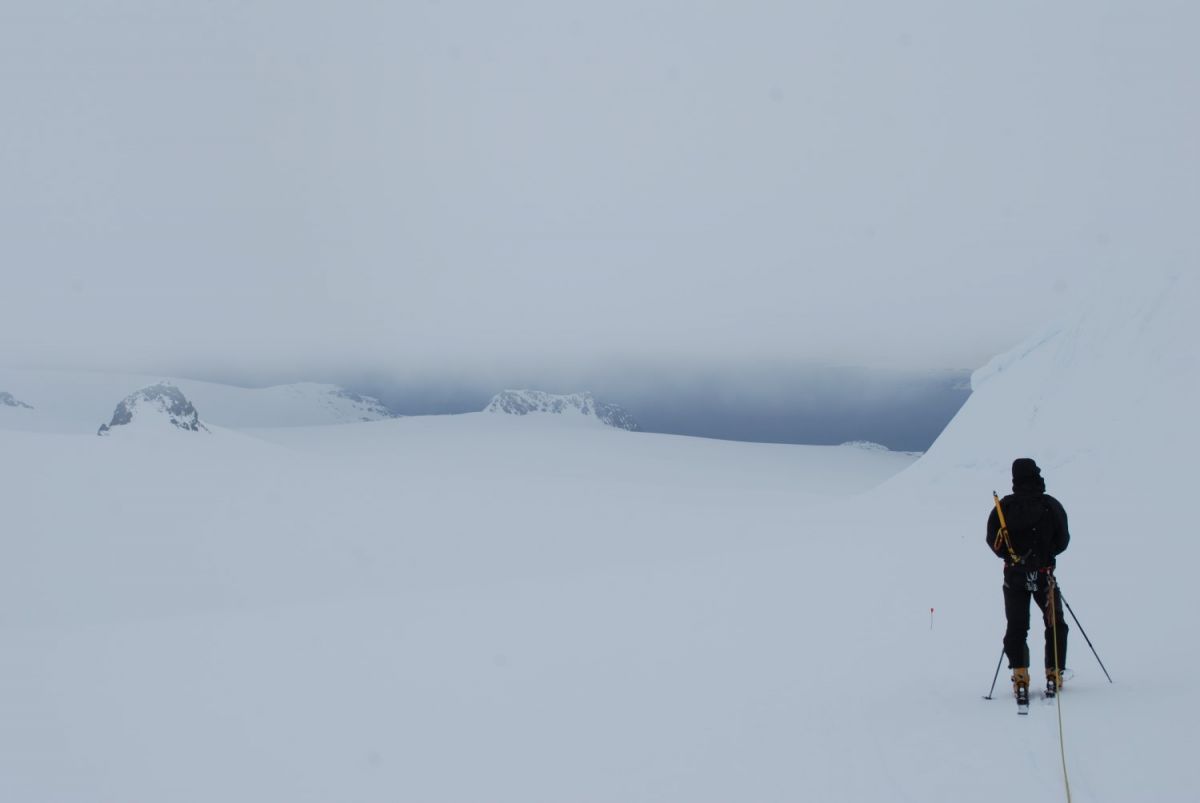 Кратко спиране на т.н. Чичеви порти, или по карта Orpheus Gate. Напред белотата пак е гарнирана с мъгла, т.е. облачността е ниска и навлизаме в нея. Флагчетата трудно се намират, но шейните напредват бързо. Кратко спиране за да изясним на Данчо, че не бива да подсича склоновете на Зограф/Лясковец, а трябва да се движим надолу до достигане на началото на ледника Huron, след което по заравнението между ледника и това което в други случаи се нарича странична морена, а в случая е началото на склоновете към билото на Тангра планина. Там трябва да се държи вдясно, тъй като има една зейнала голяма цепка, но маскиана с тънка тапа от сняг.