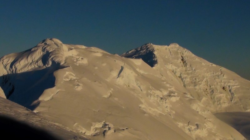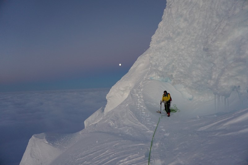 Бяхме излезли от слоя облаци, и наоколо беше необичайно чисто, тихо и красиво. Последните слънчеви лъчи хвърляха невероятни отблясъци по вр. Лясковец, напомнящ с ледовете и сераците си на огромен карфиол, и на Фрисланд отдясно, също доста насечен.