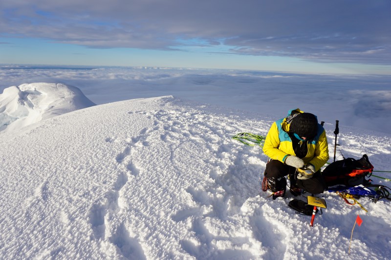 Насочихме се към Големия иглен връх по билото, което тук се разширяваше и беше лесно за ходене. Самият Голям иглен връх също имаше огромна шапка от "карфиол", странно формирани ледове във вид на пещери. Заобиколихме ги отляво, леко подминавайки върха, и след това към него. В 20:15 ч. се намираме на най-високата точка, повече от 10 ч. след стартирането ни от лагер София.