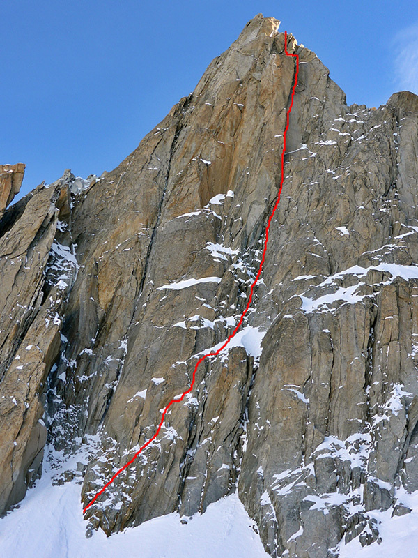 На 8 януари т. г. Хеликър и Бълък бързо преминаха споменатите три първи дължини, после още три с оценка M8, извеждащи до скален участък, който, ако не е замръзнал, е крайно ронлив. В хода на изкачването условията по стената непрекъснато се влошаваха и свръзката завърши изкачването по тъмно, водейки битка с пронизващия вятър и надигащата се виелица. Двамата стигнаха до ските си, оставените в подножието на стената, около 22.00 часа.
