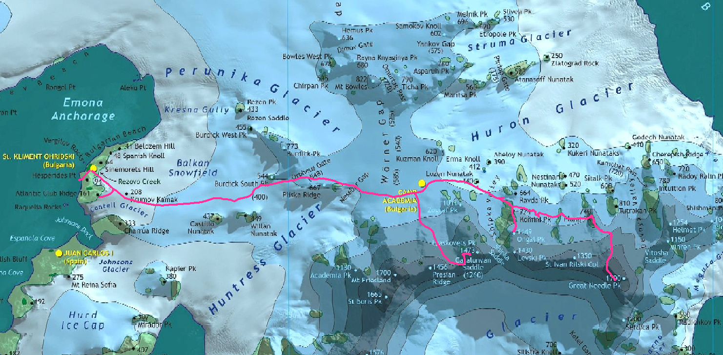 20 декември. В условия на добра видимост до 450 m и с помощта на две моторни шейни (Фиг. 4), управлявани от Йордан Йорданов и Станимир Модев и Роман Едуард се придвижваме през ледника Перуника до подножието на вр. Южен Бърдик. Тук оставяме депо с екипировка и съоръжения, а шейните се връщат в база Св. Климент Охридски. От тук продължаваме в посока Орфеева порта за достигане на лагер Академия със ски. В похода сме тримата участници - Д. Боянов, Н. Петков и А. Шопов. До Орфеева порта сме придружени от Р. Едуард. От Орфеева порта при наличието на гъста мъгла движението към лагер Академия продължава по GPS следа записана през 2013 г. За допълнителна сигурност маршрута се маркира с червени маркировъчни флагчета. След достигане на лагер Академия се спускаме 350 m по ледника Хюрон за проучване на пътя към върховете Левски и Голям Иглен. Максимална достигната точка в този ден е нунатак Лозен. Тук откриваме метална табелка с №1, поставена от експедицията през 2004/5 г. Определяме мястото като добро за изграждане на бъдещ лагер за подход към тази част на планината, а трасирания маршрут за сравнително безопасен. След преход от 14 km със ски Боянов, Петков и Шопов се прибират в база Св. Климент Охридски.