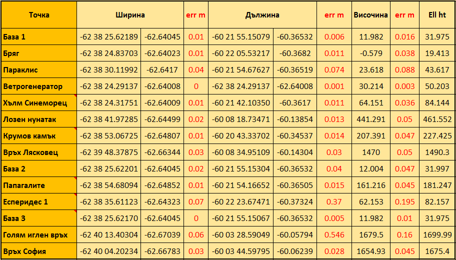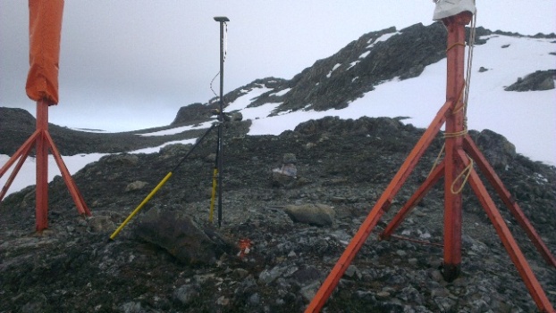 Всички измервания (Фиг. 14) са направени с два прецизни уреда Topcon GRS-1*, осигурени от Военната топографска служба на България, като съдействие при обучението и изчисленията оказа Георги Михайлов. Уредите са двучестотни, а измерването и последващата обработка на резултатите става по технологията DGPS (Differential GPS). За точките „Връх София“ и „Връх Лясковец“ са приложени 10 минутни измервания на връхната точка, при едновременно пусната измервателна станция на реперна точка, намираща се в района на базата. Тази реперна точка е намерена с многочасови измервания (точки „База 1“, „База 2“ и „База 3“). Всички останали точки са измерени с една станция, от 1 до 4 часа всяка точка, и последващи изчисления по резултатите от постоянно работещи други станции в района на Антарктида и Южното полукълбо. За снимков материал от точните места на извършените измервания вж. Приложение 1)
