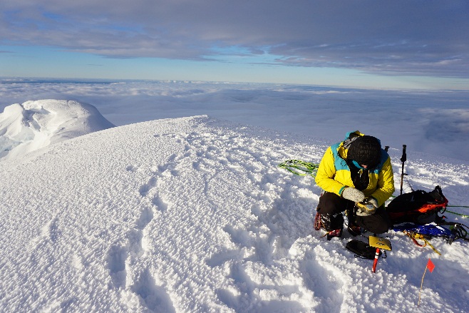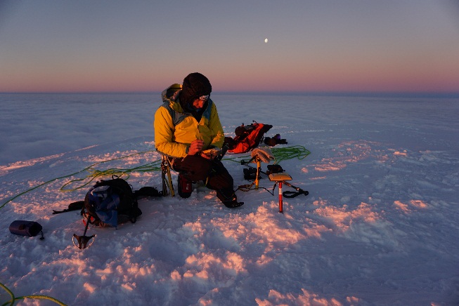 19:30 часа – достигаме лагер Академия на около 650 m. Тук опъваме малка палатка, в която остава А. Шопов, поради усилени болки от травма в крака. Боянов и Петков се отправяме към главното било по лесен за придвижване снежен склон с няколко големи цепнатини в леда, които са лесни за заобикаляне. От височина 700 m до 1100 m се придвижваме в условията на гъста мъгла. По пътя поставяме трасиращи колчета и правим запис на следа с GPS за сигурност при връщане. Над 1100 m облачността рязко се разкъсва и пред нас се разкрива великолепна планинска панорама. Под нас наблюдаваме явлението „море от облаци” (sea of clouds). От премката между Лясковец и Пресиян поемаме в посока Лясковец, с идея да се огледа пътя към вр. Левски и да се направят измервания с DGPS-а. След траверс в основата на огромна фирнова гъба, представляваща връхната част на Лясковец, се изкачваме около 50 метра вертикално на горе по ледено-фирнов склон с наклон до 70°. Употребен е един фирнов клин за междинна осигуровка. В 23:30 часа Боянов и Петков достигаме върха на Лясковец – 1470 m (Фиг. 7). Установяваме контакт по сателитен телефон и изпробваме връзката с радио-станцията с базата Св. Климент Охридски. Същата е реализирана на честотата на испанската база. В рамките на 1 час е направено измерване с DGPS-а, огледан е подхода към вр. Левски и е заснета подробно панорамата с елементи от релефа на главното било на Тангра планина. Температурата на върха е до минус 14°С.