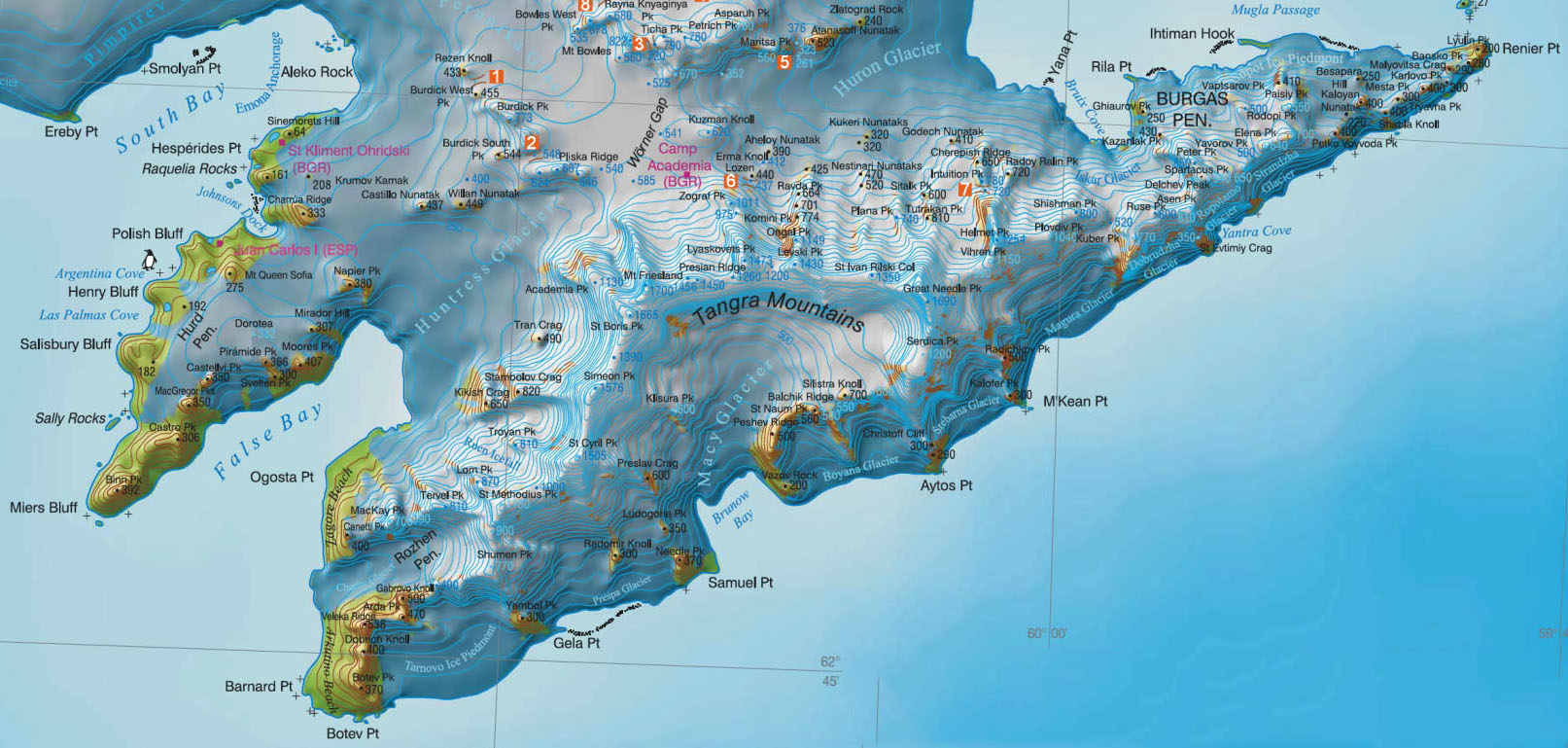 1. Връх Фрисланд (1700 m, първенец на острова): Изкачен за пръв път от каталонците Франсеск Сабат и Жорже Енрике от испанската база Хуан Карлос I на 30 декември 1991 г. , с второ изкачване от австралийците Деймиън Гилдей и Джон Бат и чилиеца Родриго Фика от ледник Перуника на 20 декември 2003 г. , и трето от Л. Иванов и Д. Василев на 15 декември 2004 г.