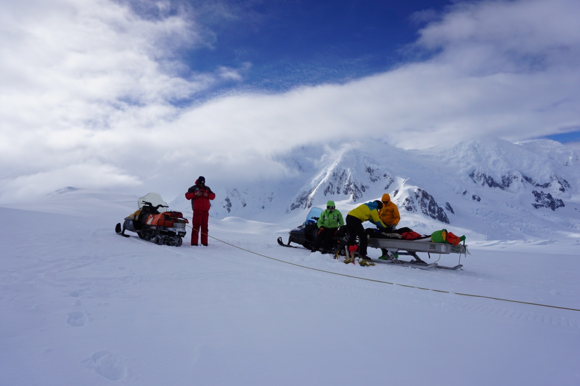 Фиг. 4. Изнасяне на багаж с моторни шейни по ледник Перуника