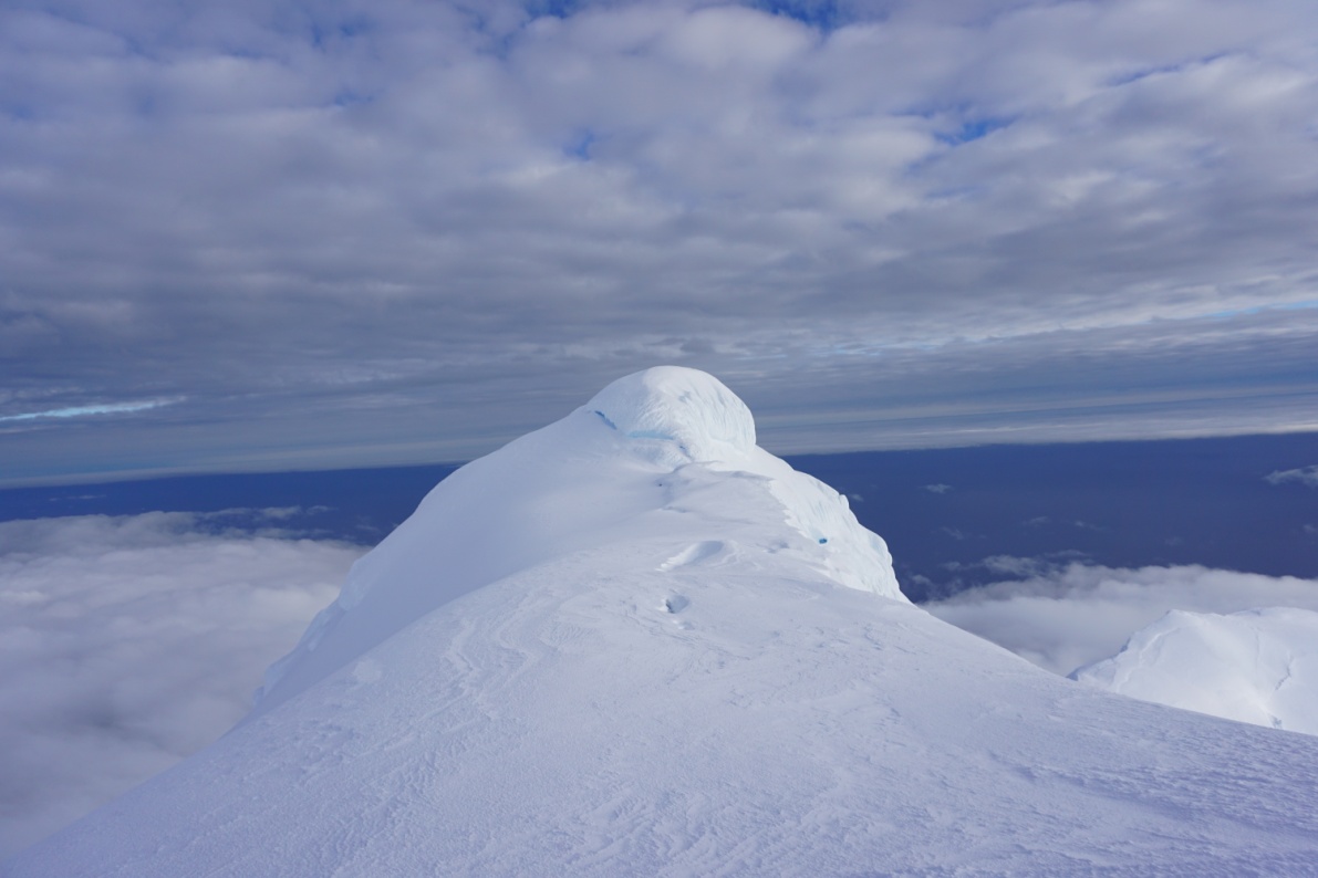 8 януари. База Св. Климент Охридски. Облачност над 800 m, липса на вятър и снеговалеж. Времето не е перфектно, но решаваме да опитаме последния си шанс за изкачване. Прогнозата за времето не е обещаваща. За около 1 час с моторните шейни достигаме на 300 метра от лагер София. Установяваме, че видимостта е лоша, но решаваме да се движим в посока Голям Иглен връх. Намираме лагера в относително добро състояние. В 10:00 часа взимаме една палатка спален чувал, примус, храна и една постелка и се отправяме към Голям Иглен връх под билото на планината. При достигането на вр. Комини се свързваме с базата по сателитния телефон за да получим последната прогноза за времето предадена ни от Фаусто. Разбираме, че ни очакват два слоя облаци, един от 800 до 1200 m и един над 1600 m. В следващите 20 часа може да разчитаме на прогноза без вятър, но след това започва рязко разваляне на времето. От вр. Комини поемаме в посока изток през ледника Южен Хюрон и ледник София. Ледниците представляват сериозна опасност за движение, предполагащи преминаването през множество огромни пукнатини по нестабилни снежни мостове. В 15:40 след вертикално изкачване по заледен склон със кратки скални пасажи излизаме през вр. Плана на гребена водещ ни към Голям Иглен връх. От тук навлизаме в гъста мъгла с видимост до 20 метра. На около 200 метра по гребена откриваме ледена площадка под голям серак. Тук оставяме палатката и предвидения багаж за евентуален лагер, и поемаме по гребена. Наклона често е до 55° като движението e по остър гребен. На около 900 m гребена опира в склона на главното било. От тук поемаме в траверс на изток през няколко ледени пукнатини и няколко вертикални ледени стенички до 10 метра височина. Движението извършваме следейки посоката с ръчните си GPS-и и снимка направена в ясно време за разпознаване на достигнати елементи от местността. На височина 1200 m облачността се разкъса и ясно различаваме линията на предстоящото ни изкачване към билото. От начало наклона е около 35-40°, но непосредствено преди билото започват обичайните фирнови гъби. На няколко места преодоляваме фирновите гъби с катерене до достигането на главното било на планината в 19:00 часа. Достигаме до връхна точка, но се оказва, че Големия Иглен връх се вижда в посока югоизток на около 400 м. От тук следва спускане по билото, което си сменя посоката от запад-изток, към югоизток. След около 150 метра достигаме премката, свързваща билото с връхната част на Голям Иглен връх. Върха представлява огромна фирнова гъба с ледена пукнатина от запад и надвиснала ледена стена в източна посока (Фиг. 8). В 20:00 часа през леден мост от запад успяваме да намерим път до върха, на който се изкачваме и тримата Д. Боянов, Н. Петков и А. Шопов (Фиг. 9). До 21:15 часа извършваме измерване с DGPS-а. От ръчните уреди установяваме, че върха е ок. 1680 m, т. е. най-вероятно е втори по височина след вр. Фрисланд (1700 m според измерването на австралийската експедиция от 2003 г.). Температурата на въздуха е минус 8°С. Връхната част на Голям Иглен връх е заравненост с размери 8x15 метра в северна посока, която е съставена от големи пера замръзнала скреж на места споена в некомпактна маса и лесно рушаща се.