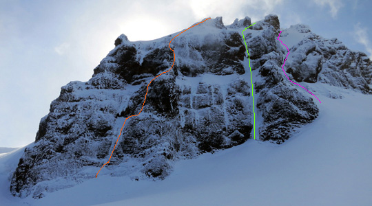 Северната стена на Колфакс с маршрутите по нея (отляво надясно):