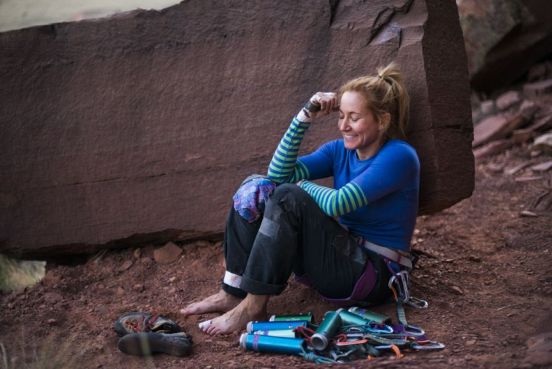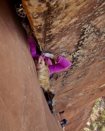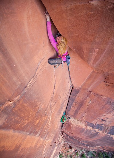 Най-новото й произведение върви по стената Сабатикъл (Sabbatical Wall) в Индиън Крийк (Indian Creek), щата Юта. “American Horror Story” предлага четири въжета (около 100 метра) трудно катерене по пукнатини с нормална ширина и off width, със собствена осигуровка, разбира се. Освен това на места скалата е много ронлива. Оттам техническатата оценка 5.13 и добавките R/ X. А ето как изглеждат отделните дължини: