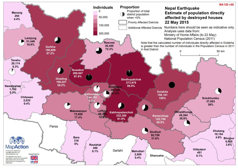 Карта на най-засегнатите от трусовете район в Непал