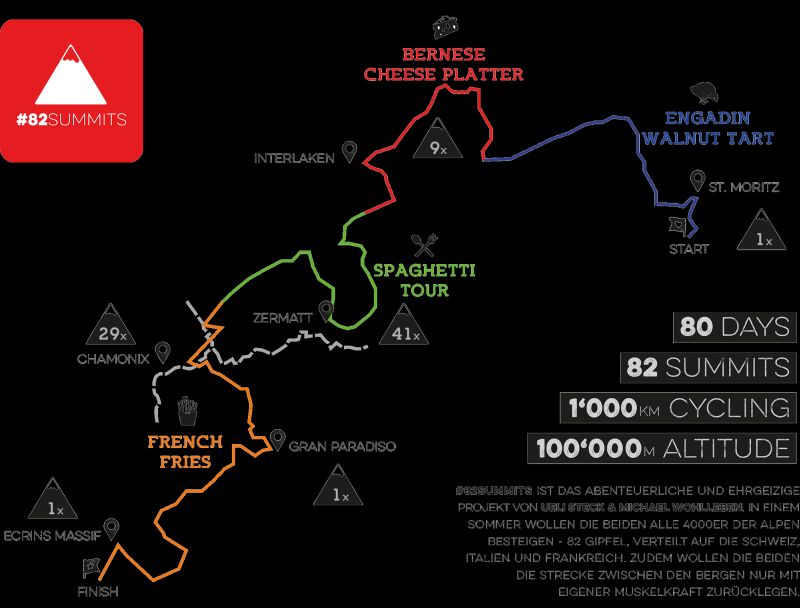 Днес, 9 юни, вторник, двама от най-талантливите и най-известните алпинисти в света – швейцарецът Ули Щек (Ueli Steck) и немецът Михаел (Мики) Волебен (Wohlleben), започват опита си да изкачат всичките 82 върха в Алпите с височина над 4000 метра за 80 дни.