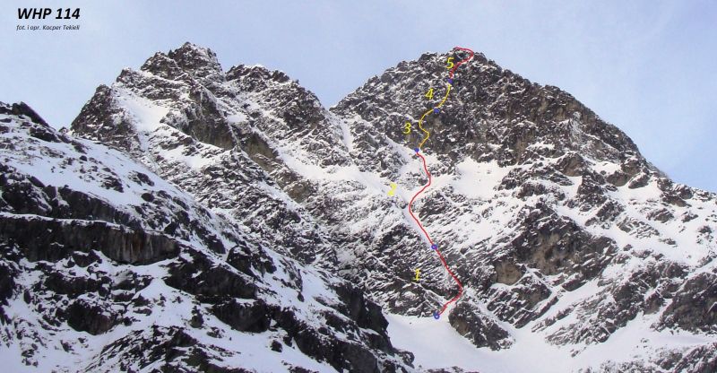 *Изкачен е за първи път на 20 януари 1930 г. от Ян Киелпински (Jan Kiełpiński), Збигниев Коросадович (Zbigniew Korosadowicz) и Витолд Х. Париски. Горната част на стената е преодоляна на 16 август 1928 г. от Виеслав Станиславски (Wiesław Stanisławski) и Юстин Тимон Войшнис (Justyn Tymon Wojsznis). Върви по източната стена на Кошчиелец и е един от най-популярните маршрути за обучение на млади алпинисти (V минус, 300 метра, при дължина на стената 240 м).
