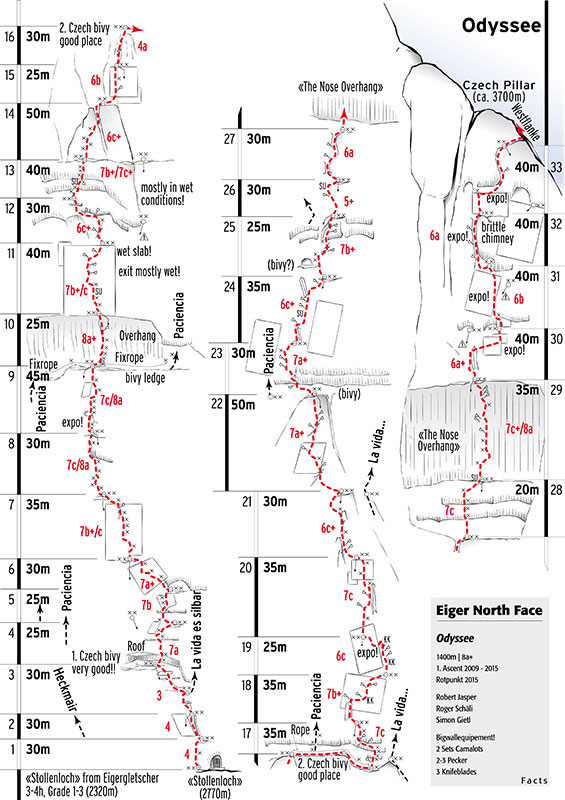 През август т. г. се появи нова линия, която претендира да е най-трудната по знаменитата северна стена на Айгер – “Odyssee” (8a+, 1400 м). Това стана с усилията на международната свръзка Рогер Шели (Roger Schäli, Швейцария), Роберт Яспер (Robert Jasper, Германия) и Симон Гийтл (Simon Gietl, Италия).