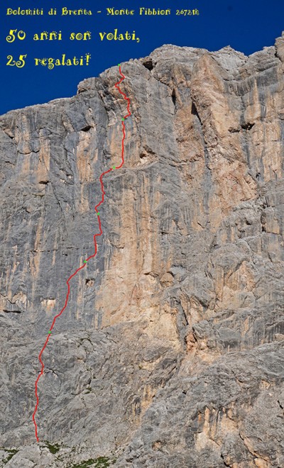 Известният италиански катерач Роландо Лархер (Rolando Larcher) отпразнува своя 50-годишен юбилей. При това – по типично “катерачески” начин, с нов маршрут. Заедно с екип, в който бяха Херман Дзанети (Herman Zanetti), Лука Джиупони (Luca Giupponi) и Алесандро Лархер (Alessandro Larcher), той прокара по източната стена на Монте Фибион (Monte Fibbion) в масива Брента (Brenta), Доломитите, линията “50 anni son volati, 25 regalati!” (215 м, 8a+ max, 7b obl.).