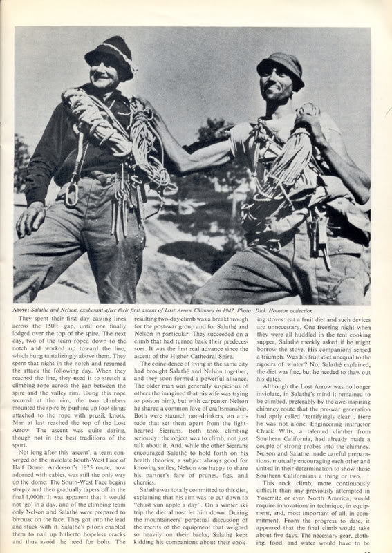 Формацията е изкатерена едва през 1946 г. от Джон Салате (John Salathe) и Антън Нелсън (Anton Nelson). Двамата прокарват линията “Lost Arrow Chimney” (V, 5.10a). Това е първият маршрут с bigwall оценка V в САЩ и изобщо в Северна Америка.