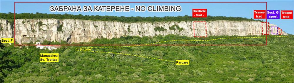 Постигнато е съгласие за възстаноивяване на спортните маршрути в сектор G (5 маршрута). Забрана за катерене и разекипиране на трад маршрутите вляво от мястото, където пътеката опира в скалите. Забраната обхваща зоната до оградата на манастира (както и самия манастир). Зоната вдясно от сектор G остава зона за традиционно катерене. Консултиране на нуждата от сезонна забрана. Като алтернативна за скалолюбивите обитатели се обособява и няма да се катери по скалите западно от р. Янтра - веригата над Преображенския манастир.