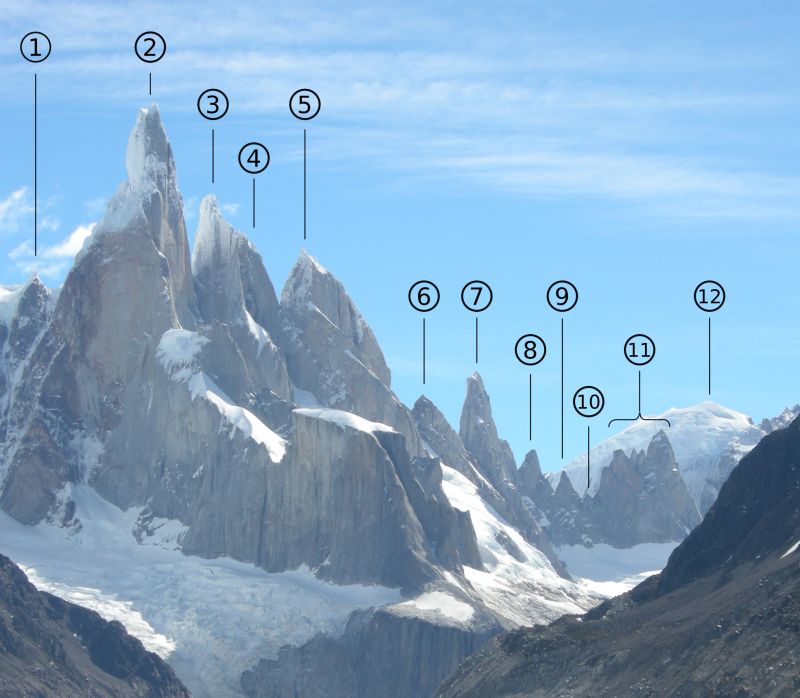 Групата на Серо Торе: 2 – Серо Торе, 3 – Торе Егер, 4 – Пунта Ерон, 5 – Иглата Щандхардт,