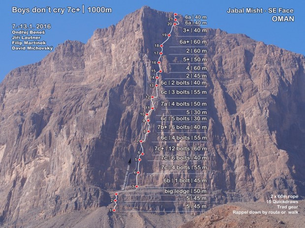 Чешката свръзка Давид Миховски (David Michovský), Ондра Бенеш (Ondra Beneš), Иржи Лаутнер (Jiri Lautner) и Филип Мартинек (Filip Martínek) прокара нов маршрут по над 1000-метровата стена Джебел Мишт (Jebel Misht) в Оман.