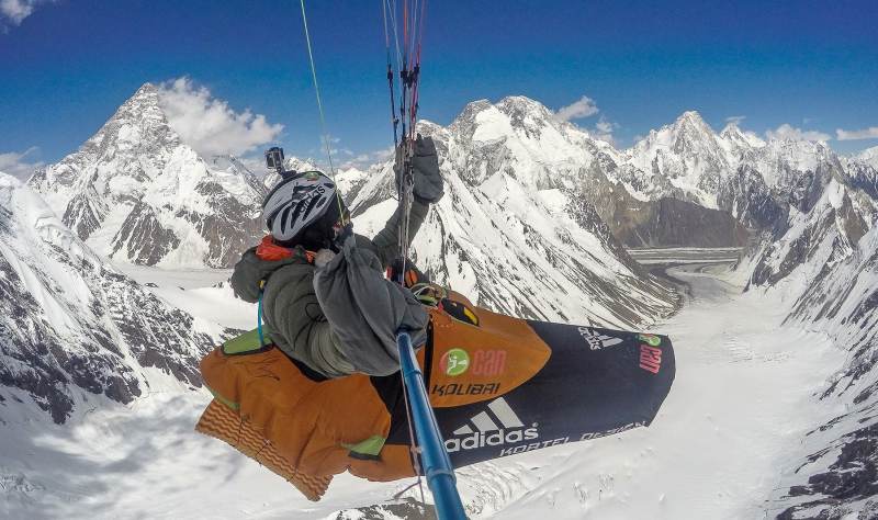 На 23 юли т. г. Антоан Жирар (Antoine Girard)* направи исторически полет с параплан. Французинът, стартирайки самостоятелно от земята, се издигна на височина 8127 м и прелетя над кулминацията в масива на Броуд пик (8047 м), 12-тият връх в света.
