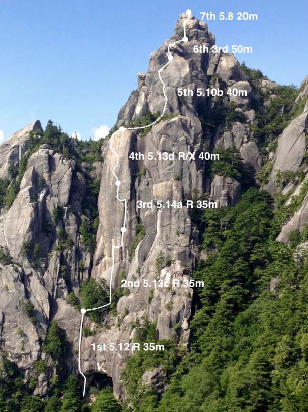 Те работеха върху свързването в едно на седемте въжета на изключително трудния и опасен trad-маршрут “Senjitsu-no Ruri” (5.14a, R/ X, 250 м). Финалното цялостно изкачване бе осъществено през април т. г.