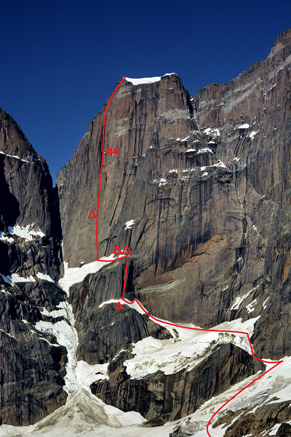 Алпинистите решиха да стигна до целта си по вода, с каяци. Поради това пътят от селището Аапилатог (Aappilattoq, по-рано Augpilagtoq) до основата на стената им отне седем дни. Самото изкачване продължи от 29 юли до 3 август т. г.