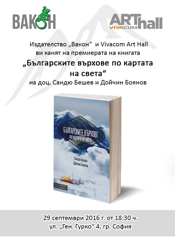 Издателство "Вакон" и Vivacom Art Hall ви канят на премиерата на книгата "Бългаските върхове по картата на света" с автори Дойчин Боянов и Сандю Бешев. Събитието ще се състои в четвъртък, 29 септември 2016 г. от 18:30 в залата на ул. "Генерал Гурко" 4, София.