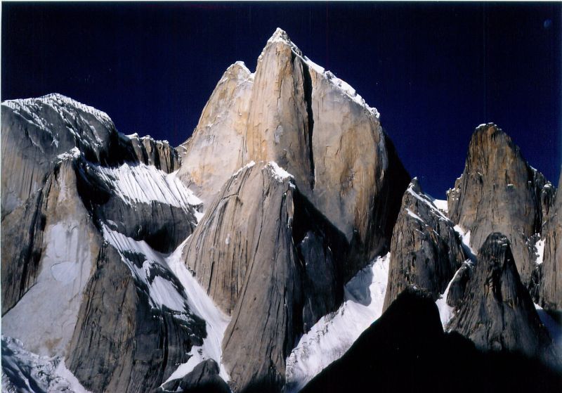 *Първото изкачване на Голямата кула нa Транго (Great Trango Tower, 6296 м) е дело на Гейлън Рауъл (Galen Rowell), Джон Роскели (John Roskelley, носител на “Златен пикел” за цялостната си кариера през 2014 г.), Ким Шмитц (Kim Schmitz), Джим Мориси (Jim Morrissey) и Денис Хенък (Dennis Hennek). Маршрутът им започва от запад, от страната на ледника Транго, продължава по система от ледени жлебове и скални стени и завършва с преодоляване на горната част на Южната стена.