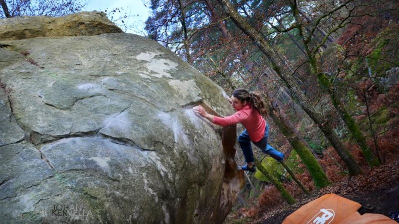 А това не е никак лесно в този френски район. Там французойката записа своя top-проблем. Използвайки отличните условия, тя премина “La cicatrice de l’Ohm” (8B), в сектора Мар о Корней (Mare aux Corneilles).