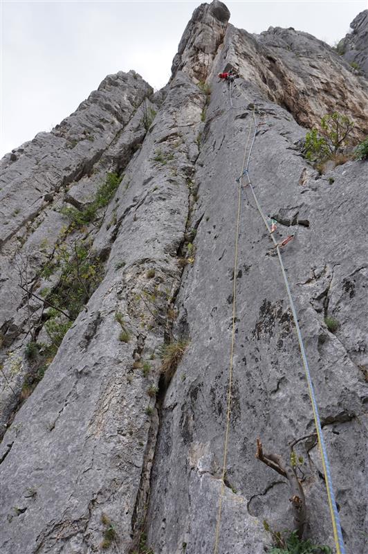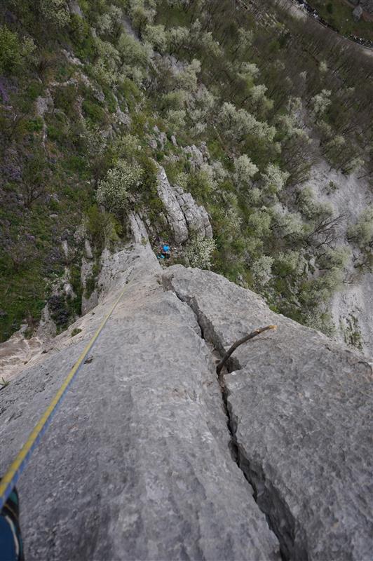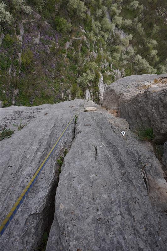 Въже 2: 31м, 5 клина. По ръба и после през цепката в дясно на ръба, където е леко надвесено и тук е въздушният пасаж на второ въже, 6b+, клинове в началото после на джаджи. Много красива цепка до края на въжето. Площадка на два болта. С 60м двойно въже може да се слезе с един рапел до долу.