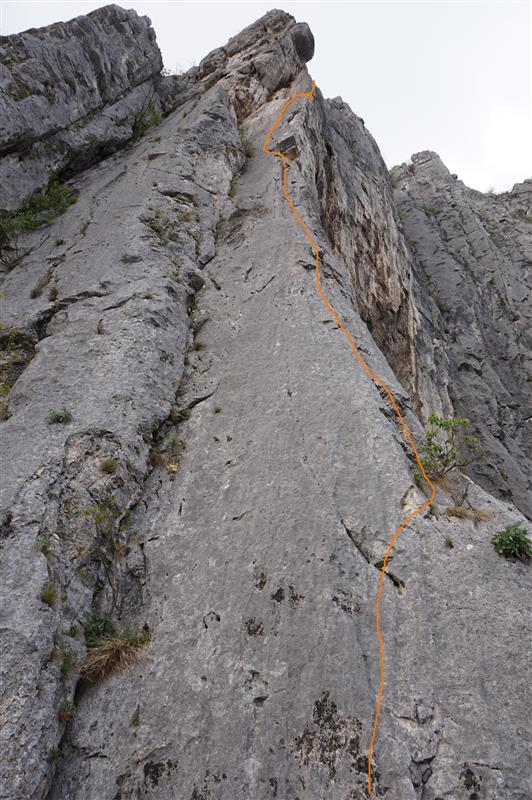 Въже 1: 33м, 9 клина. По плочата вдясно от Джина и прехвърляне към ръба след 2-3 метра. По ръба, 6 кат., до под таванче, което се вижда отдолу. Заобикаляне от ляво и катерене по плочата осигурена с клинове, където е пасажът на първо въже. 6b+, 6c?. На края на плочата има 2 клина близо един до друг, при тях траверс надясно! Болтът на площадката е на ръба на нивото на клиновете и не се вижда от плочата. Нагоре продължават старите клинове на Джина, а вдясно на самия ръб се виждат новите клинове на второто въже. Площадка на един болт, може да се дублира с горния клин или първият да включи горните клинове след като изкатери първо въже.