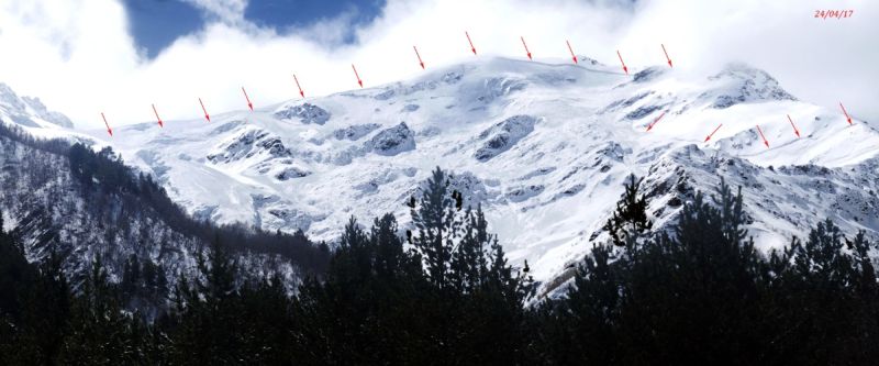 Със стрелките е показна линията на откъсване на лавината, на места склонът е изстърган до ледената подложка