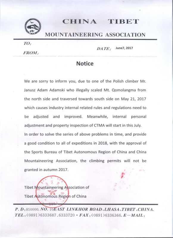 Няколко източника информират, че до края на тази година няма да бъдат издавани разрешения за изкачвания на осемхилядници откъм територията на Тибет (става дума за Шиша Пангма, Чо Ойю и Еверест – бел. пр.). В официален документ на тамошните власти като причина за взетото решение се посочва нелегалният траверс на Еверест (от север на юг) на полския алпинист Януш Адамски (Janusz Adamski).