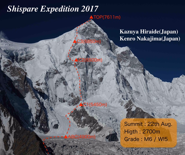 Стигането до Шиспаре от североизток е по най-трудния възможен маршрут на този връх. Линията преодолява 2700 метра денивелация. Хираиде и Накаджима оцениха трудността й с M6/ WI5. Изкачването им може да се окаже най-голямото алпийско постижение на годината.