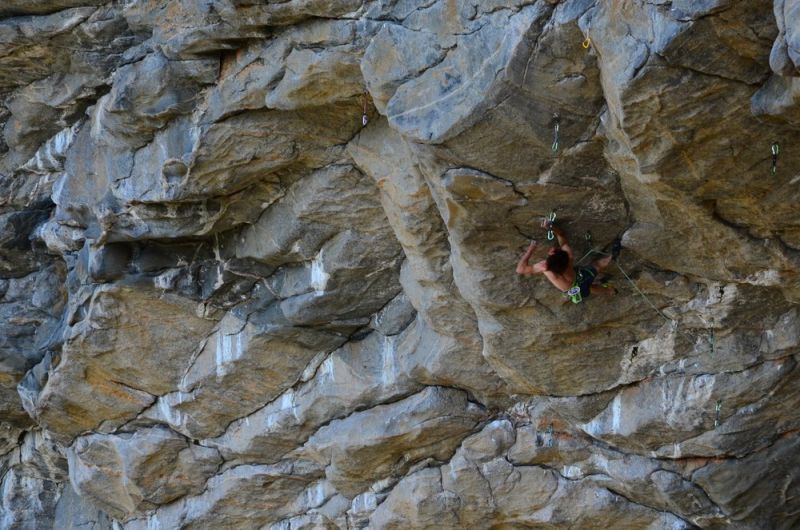 - боулдър 8C (първи crux, 10 движения, невероятна последователност, преодолявана с краката нагоре),