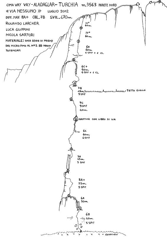 “Nessuno” (470м, 8a+ max., 7b obl.) се появи през лятото на 2012 г. благодарение на усилията на Роландо Лархер (Rolando Larcher), Лука Джюпони (Luca Giupponi) и Никола Сартори (Nicola Sartori). Линията върви по широката почти 600-метрова северна стена на върха Вай Вай (Vay Vay, 3563 м). Идеята за прокарване на премиерен маршрут в толкова отдалечен и трудностъпен район бе подхвърлена на италианците от местния алпинист и стопанин на къмпинг Реджеп Индже (Recep Ince). И така, през 2012 г., след 15-дневна акция, тримата италианци постигнаха пълен успех, преминавайки тура в стил RP.