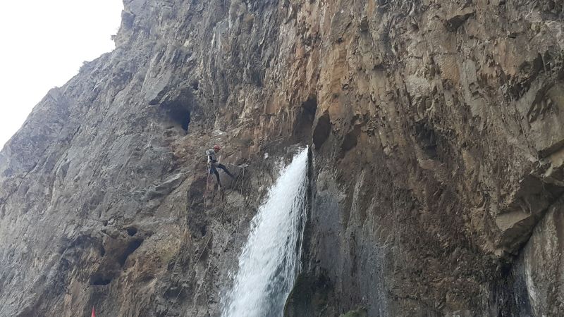 Вторият целеви район беше водопадът Абшир-Ата. В продължение на 2 дни бе изкачена вертикална стена на каньон и бяха проучени изходището на карстов извор с голям дебит, който преминава в 20-метров водопад, както и околни отвори с цел да се проникне от долната страна в подземна карстова дренажна система. В резултат стана ясно, че става дума за сифонна част на системата без възможност за проникване в нея.