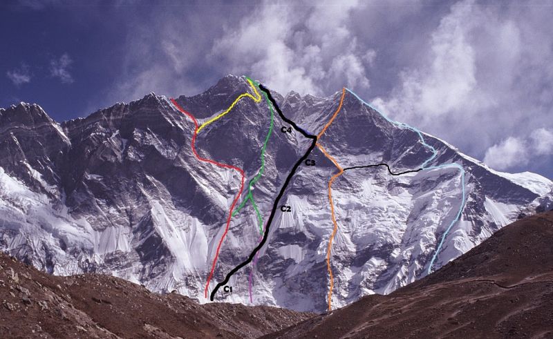 Южната стена на Лхотце – корейският маршрут е маркиран с черната линия
