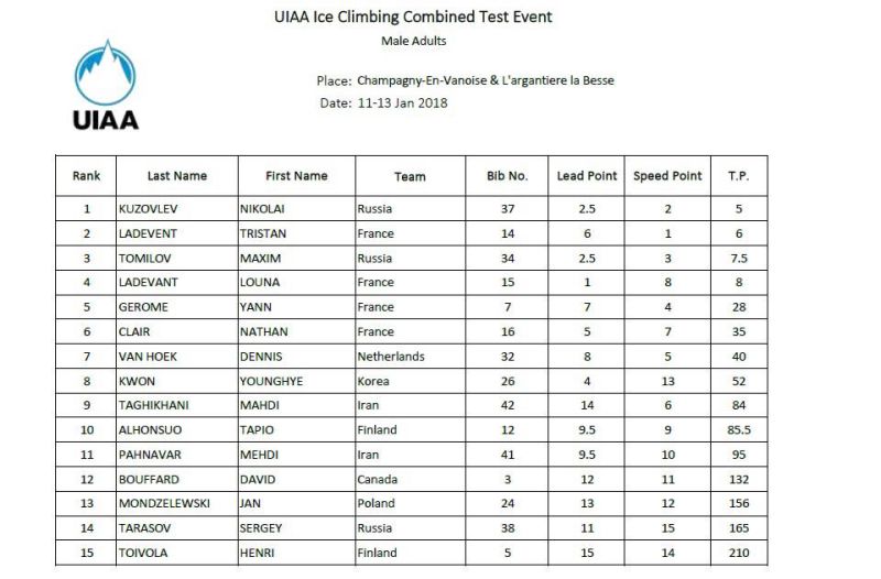 От 11 до 13 януари т. г., в рамките на поредния старт за Европейската купа, която си оспорват катерачите по лед, беше проведена първата надпревара по нова формула – комбинация от дисциплините “скорост” и “трудност”.